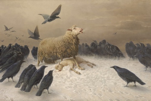 MUDECOR Premium Framed Lamenting Sheep with Ravens Symbolic Animal Scene Illustrations Impressionism Scenic Colorful Living Room Bedroom Office Gold