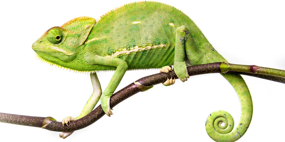Chameleon Chamaeleo calyptratus on a Branch Stretched and Framed