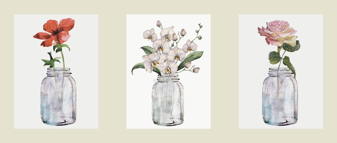 Framed Collage Set Roses and Daisies in Glass Vases Nature Plants Watercolor Illustrations Decorative Living Room Bedroom Office Black