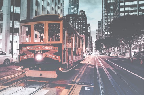 Framed Duotone Blue Red San Francisco Cable Car Architecture Maps Cities Photography Realism Rustic Scenic Colorful Living Room Bedroom Office Natural