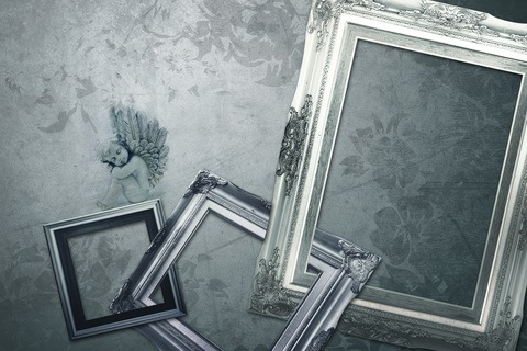 Antique Grayscale Frames with Angel on Top Sitting on a Floral paper Background