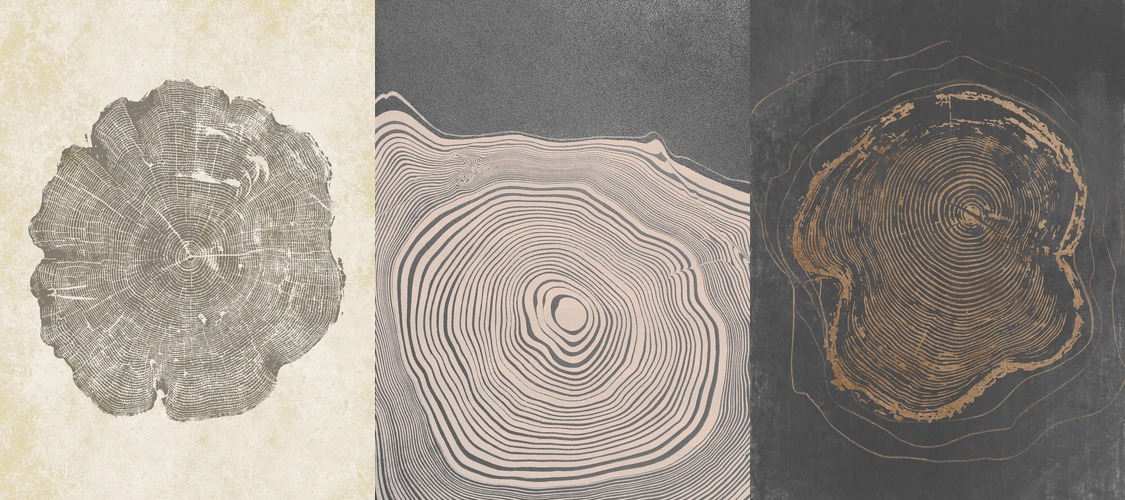 Adhesive Poster Set Pastel Gray Wood Tree Ring Spirals Nature Abstract Drawing Contemporary Decor Living Room Bedroom Office