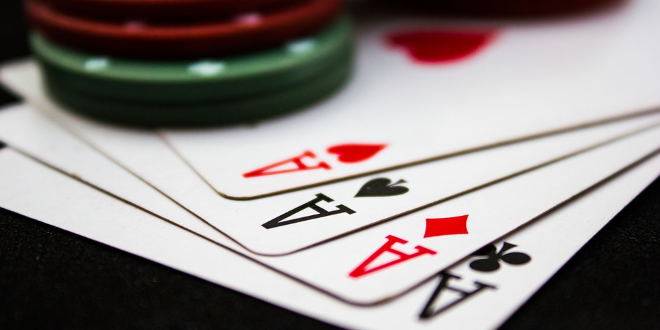 Cards Laying Around with Poker Chips on top Stretched and Framed