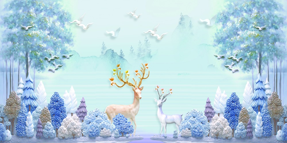 Framed Set Elk with Flower Antlers in Winter est Nature Wilderness Illustrations Rustic Colorful Pastel Living Room Bedroom Office White