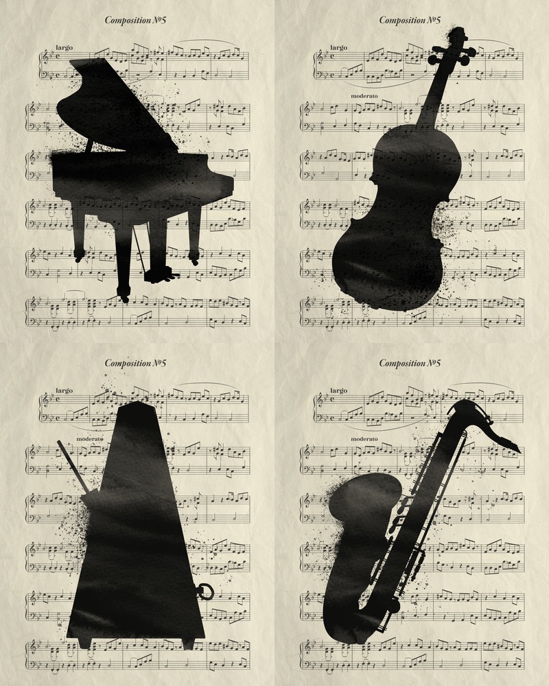 Woodrose Framed Collage Set Music Instrument Silhouette Music Sheets Culture People Illustrations Decorative Multicolor Living Room Bedroom Office White
