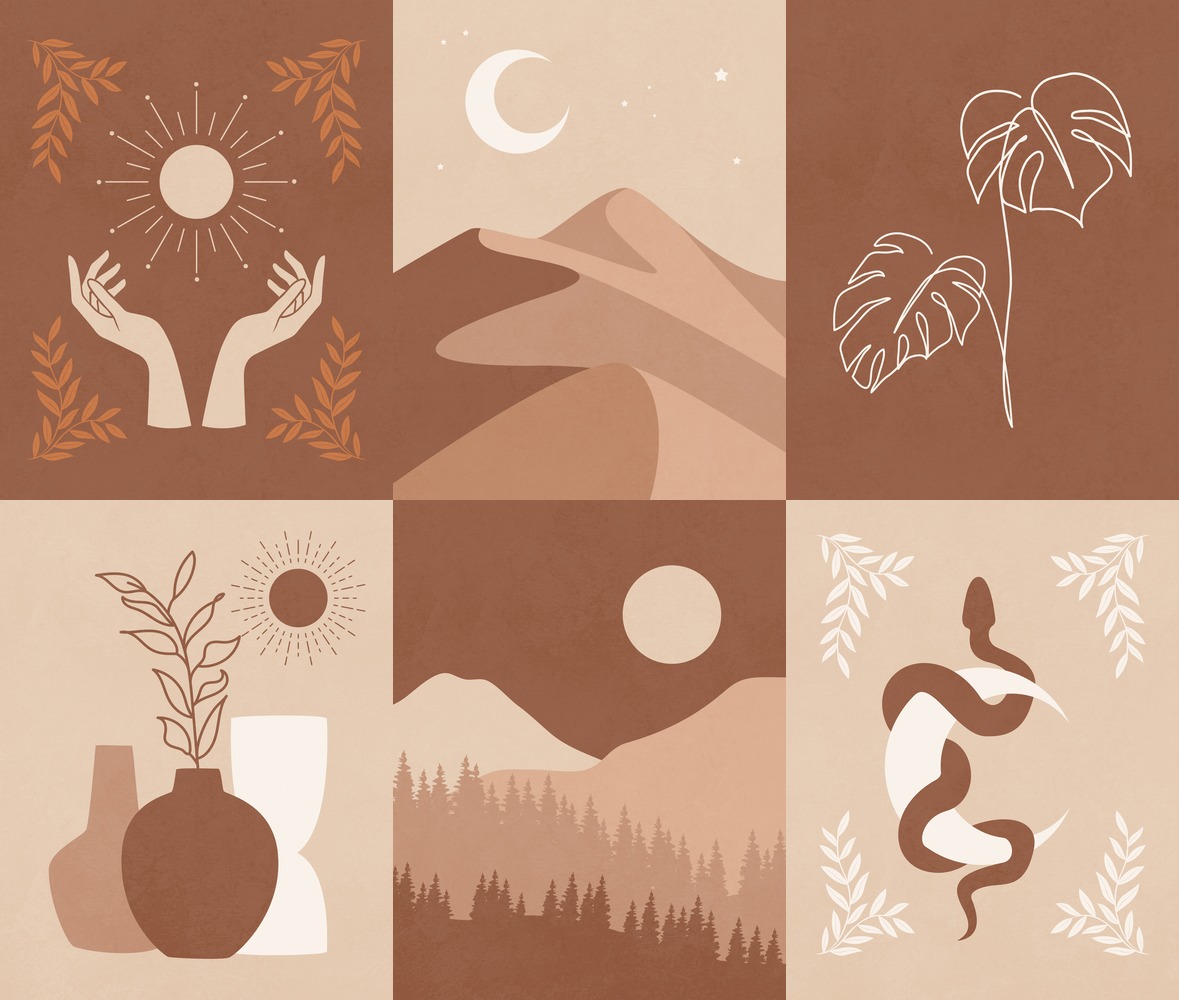 SIGNLEADER Collage Set Mid Century Mystic Rustic Symbols Nature Wilderness Illustrations Decorative Colorful Living Room Bedroom Office Unframed
