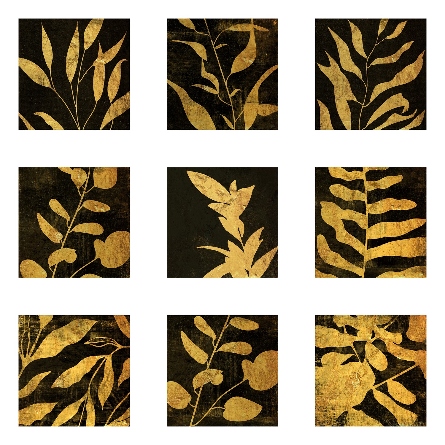 Woodrose Studio Framed Collage Set Gold and Black Leaf and Flower Silhouette Botanical Wilderness Digital Whimsical Living Room Bedroom Office White