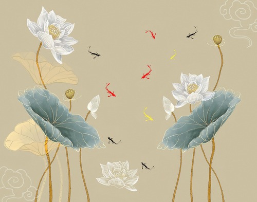 Adhesive Poster Delicate Lotus Flowers and Playful Koi Fish in AsianInspired Design Illustrations Realism Rustic Nature RelaxCalm Multicolor Living Room Bedroom Office