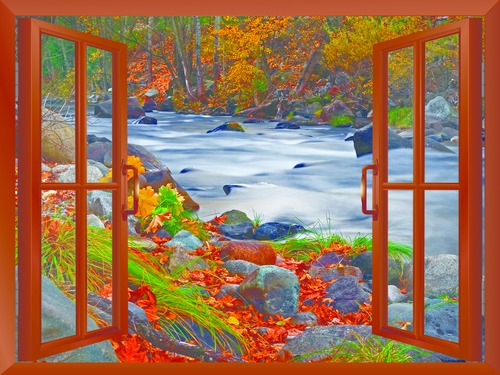 Copper Window Looking Out Into a Rocky River Surrounded by Trees Home