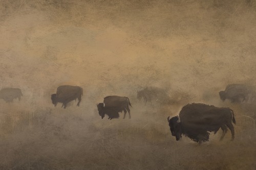 Framed Moody Bison Landscape Rustic Wildlife in Foggy Tones Impressionism Traditional Scenic Living Room Bedroom Office NATURAL