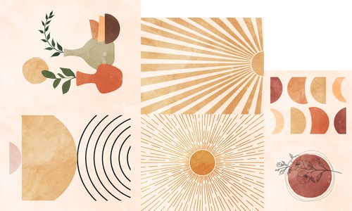 Framed Collage Set of Pastel Shining Sun Plant Vase Polygons Abstract Shapes Decorative Living Room Bedroom Office Black