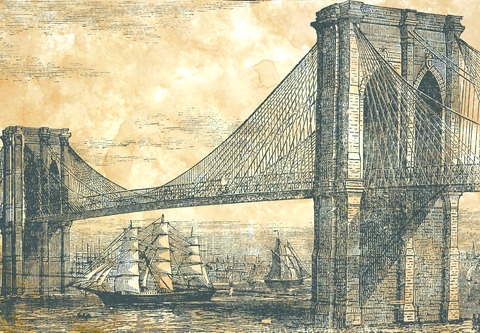 Engraved Illustration Brooklyn Bridge Suspension Bridge with Sailed Ships Navigating Below Mural Removable Sticker