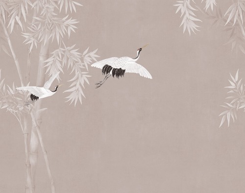Adhesive Poster Flying Cranes with Bamboo Motif in Minimalist Illustrations Realism Rustic Nature RelaxCalm Multicolor Living Room Bedroom Office