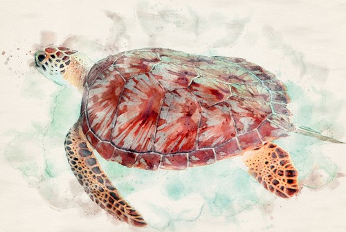 Brown Hawksbill Sea Turtle Swimming Underwater Marine Life Ocean Watercolor Nautical Portrait Colorful Pastel Living Room Bedroom Office