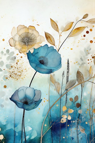 MUDECOR Framed Blue Watercolor Poppies with Gold and Bronze Flecks Illustration RelaxCalm Warm work Black Frame