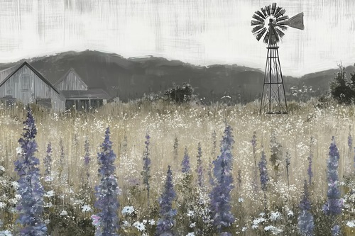 Rustic Farm and Windmill Country Barn Scene with Wildflowers Illustrations Fine Traditional Colorful Dark Living Room Bedroom Office