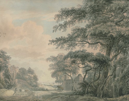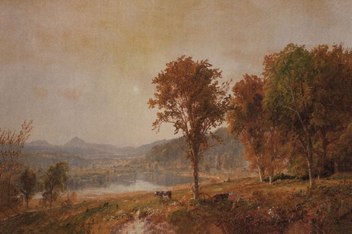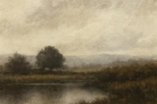 Pastoral River Landscape Classic Countryside Scene with Trees and Cattle Illustrations Fine Traditional Colorful Dark Living Room Bedroom Office