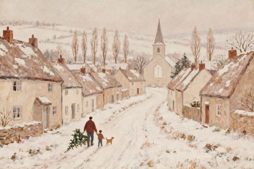 Snowy Village with Father and Child Cozy Winter Countryside Illustrations Scenic Colorful Multicolor Warm Living Room Bedroom Office