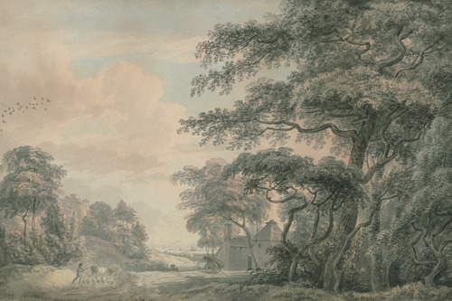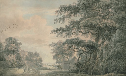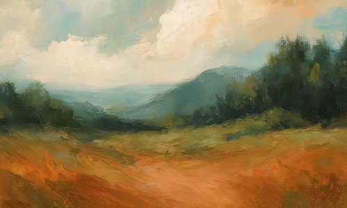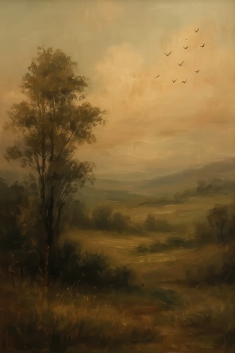 Serene Green Valley Peaceful Countryside Landscape Under Cloudy Sky Illustrations Fine Traditional Colorful Dark Living Room Bedroom Office