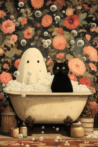 Framed Cute Ghost and Black Cat in Bathtub Halloween Photography Decorative Living Room Bedroom Office NATURAL