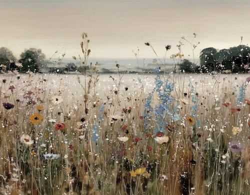 Extra Large Framed Wildflower Meadow Landscape Soft Pastel Field Illustration Home Living Room Bedroom Decor (Frame Assembly Required)