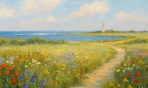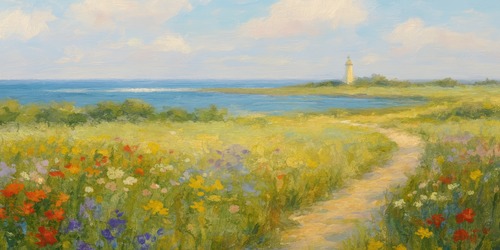 Extra Large Framed Wildflower Path to Lighthouse Colorful Coastal Landscape Illustration Home Living Room Bedroom Decor (Frame Assembly Required)