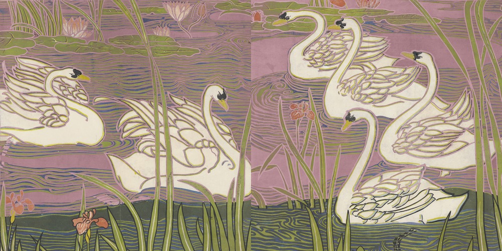 Framed Nouveau Swan Lake Elegant Waterfowl Illustrations Boho Nature Colorful Chic Living Room Bedroom Office Natural
