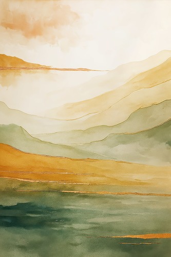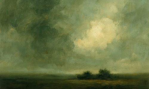 Serene Green Valley Peaceful Countryside Landscape Under Cloudy Sky Illustrations Fine Traditional Colorful Dark Living Room Bedroom Office