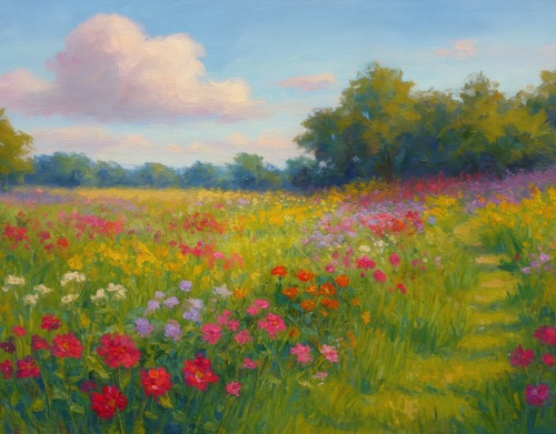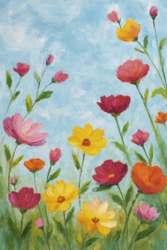 Extra Large Framed Blooming Meadow Colorful Wildflower Field Illustration Home Living Room Bedroom Decor (Frame Assembly Required)