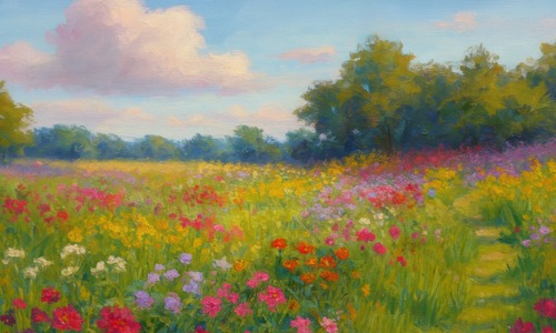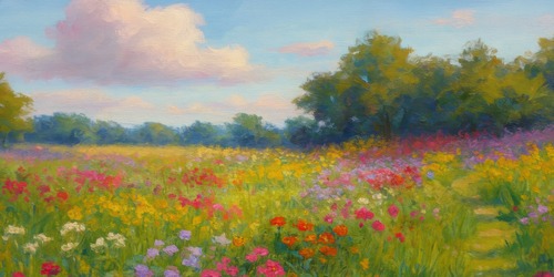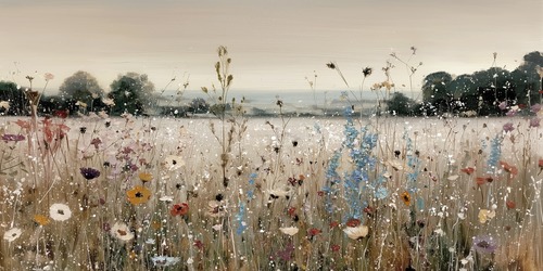 Extra Large Framed Wildflower Meadow Landscape Soft Pastel Field with Blooming Flowers and Trees Illustration Home Living Room Bedroom Decor (Frame Assembly Required)
