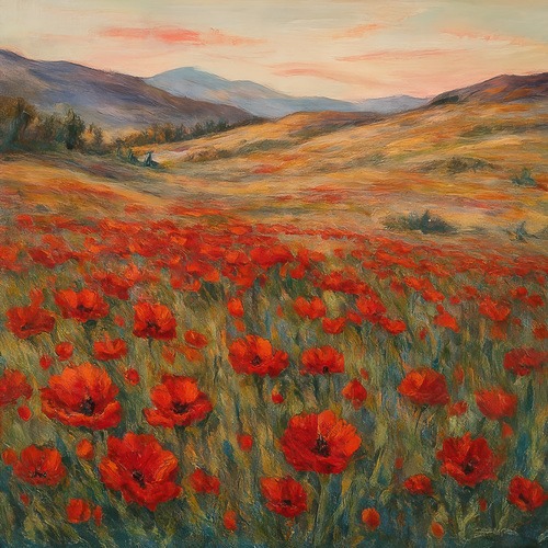 MUDECOR Framed Crimson Poppy Field Landscape Blooming Red Flowers Illustrations Realism Decorative Scenic Panoramic Earth Living Room Bedroom Office BLACK