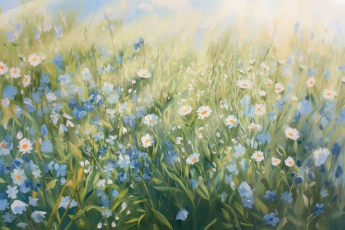 Framed Blooming Wildflower Meadow Soft Green and Blue Floral Landscape Illustrations Rustic Dramatic Living Room Bedroom Office NATURAL