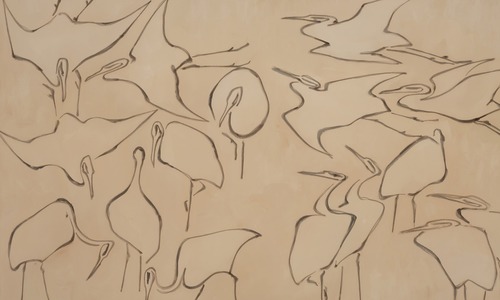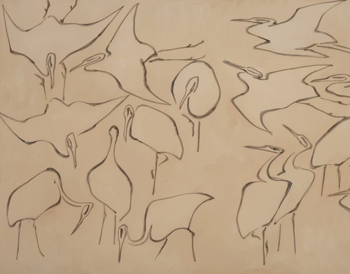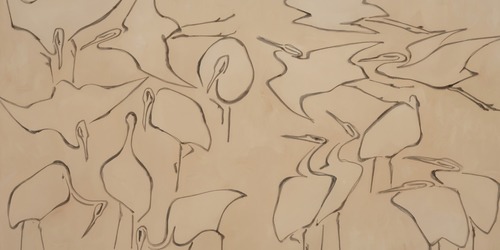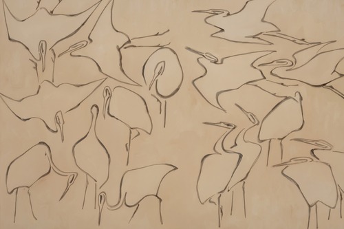Extra Large Framed Gentle Minimal Line Cranes on Warm Beige Home Living Room Bedroom Decor (Frame Assembly Required)