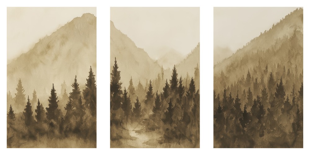 Framed Set Misty Mountain Pine Landscape Neutral Sepia Tone Nature Illustrations Decorative Chic Calm Living Room Bedroom Office Natural