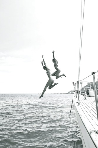 MUDECOR Framed Black and White Women Jumping Off Yacht Retro Ocean Illustrations Bohemian Living Room Bedroom Office BLACK