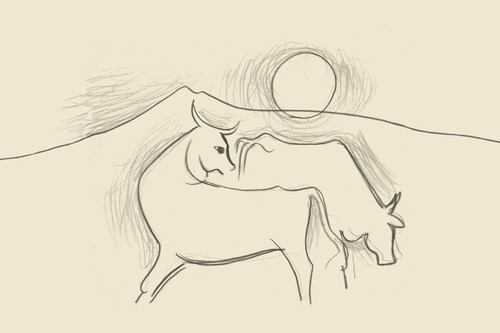 MUDECOR Framed Gentle Gaze Sketch of a Serene Cow Illustration RelaxCalm Warm work Black Frame