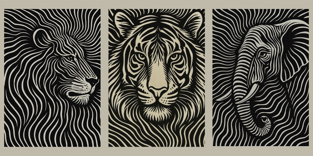 Framed Safari Animal Portrait Lion Tiger and Elephant Photography Minimalist Black and White Living Room Bedroom Office Black