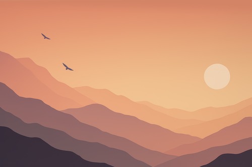 Framed Sunset Mountain Landscape Warm Orange Abstract Nature Scene with Birds Illustrations Decorative Calm Living Room Bedroom Office Black