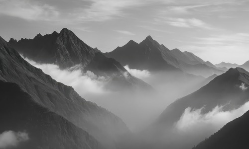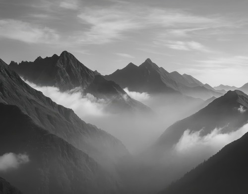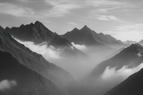 Misty Mountain Valley Serene Autumn Morning Landscape Photography Realism Decorative Elements Calm Grey Cool Black and White Living Room Bedroom Office