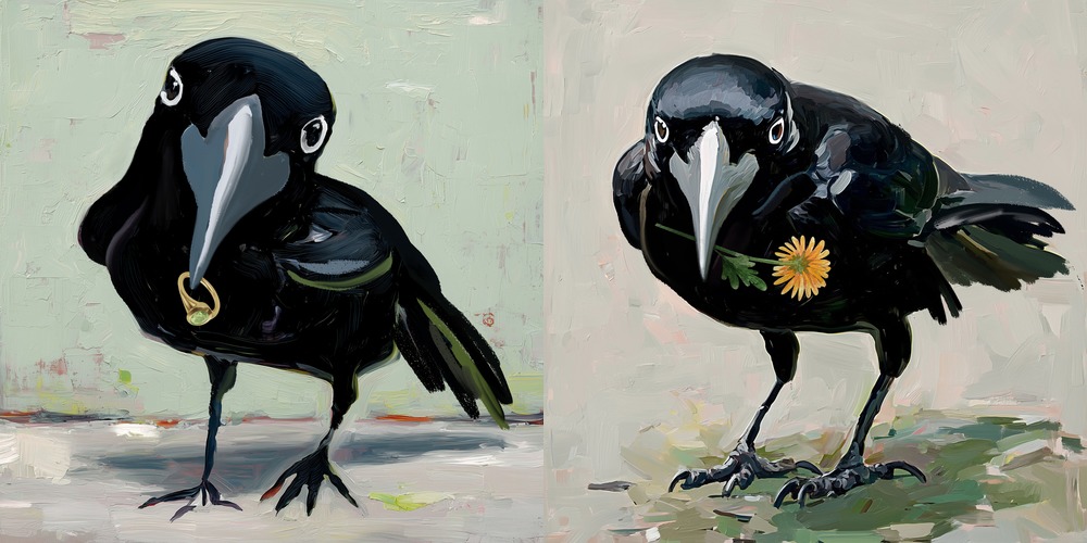 Framed Whimsical Crow Black Bird with Ring and Flower Illustrations Boho Nature Colorful Chic Living Room Bedroom Office White