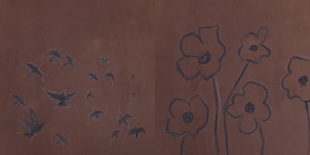 Framed Rustic Sketch Birds in Flight and Wildflower Line Illustrations Boho Nature Colorful Chic Living Room Bedroom Office White