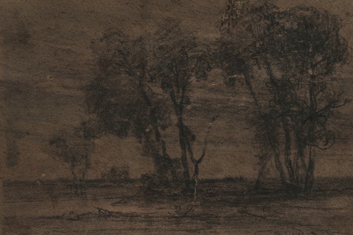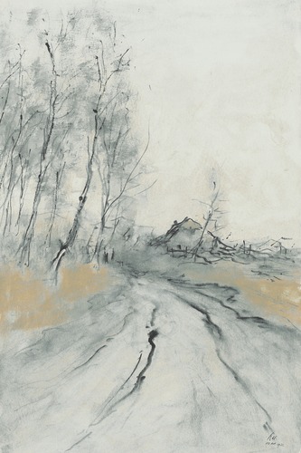 Framed Set Winter Roadside Scene Charcoal Drawing Bare Trees and Distant Farmhouse Illustrations Landscape Living Room Bedroom Office Natural