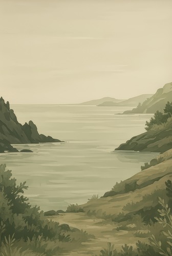Premium Framed Serene Coastal Cliffside and Ocean Horizon Minimalist Landscape Illustrations Fine Farmhouse Decorative Rustic Vintage Antique Classic Bedroom Black