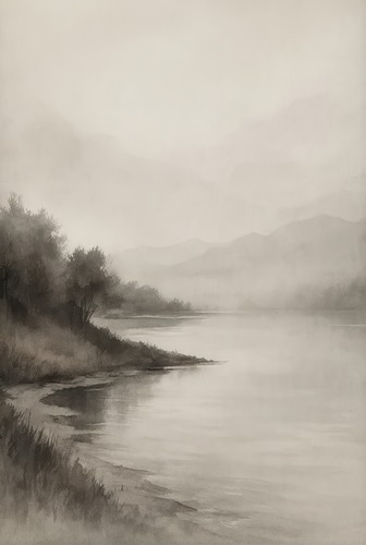 Premium Framed Monochrome Lake and Mountain Mist Landscape Illustrations Fine FarmhouseCountry Decorative Rustic Vintage Antique Classic Bedroom Black