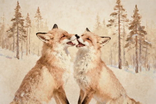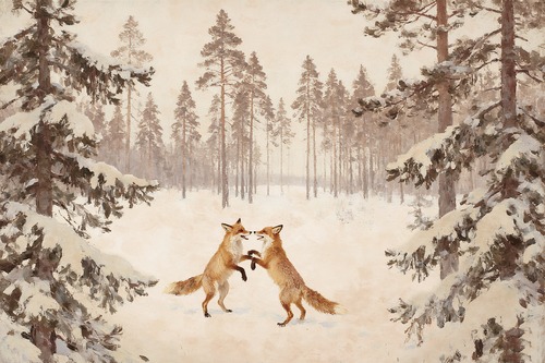 Winter est with Foxes Serene Snow Landscape Nature Illustrations Scenic Colorful Multicolor Warm Living Room Bedroom Office