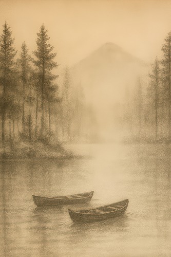 Premium Frame Misty Lake with Rowboats Sepia Drawing Tranquil est and Mountain Illustrations Fine Traditional Iconic Living Room Bedroom Office Natural