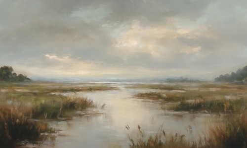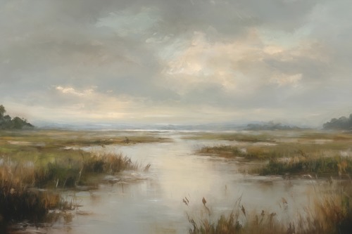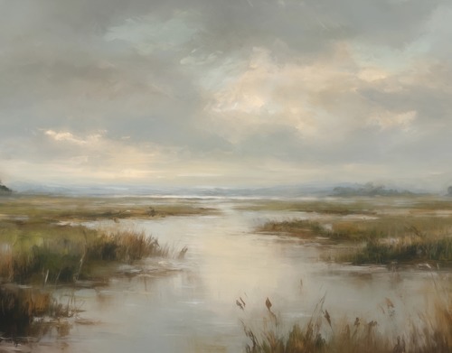 Ashbrook Framed Coastal Marshland Landscape Tranquil Green Wetland Painting with Water Reflections Illustrations Calm Living Room Bedroom Office WHITE