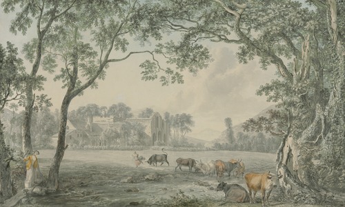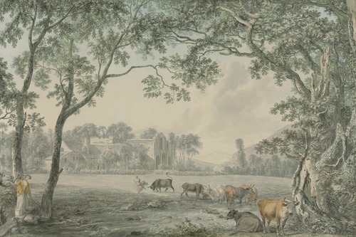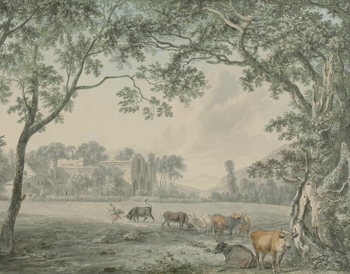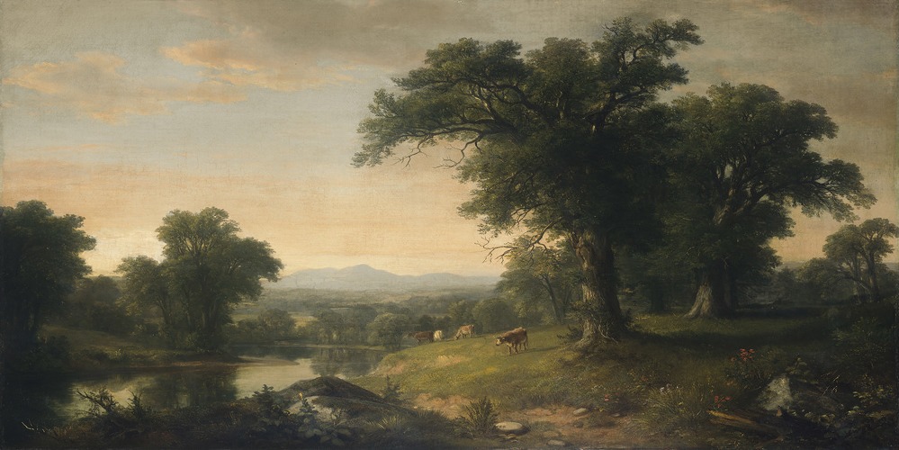 Pastoral River Landscape Classic Countryside Scene with Trees and Cattle Illustrations Fine Traditional Colorful Dark Living Room Bedroom Office