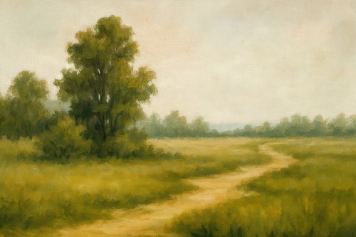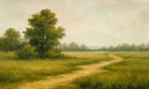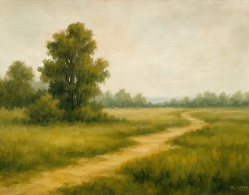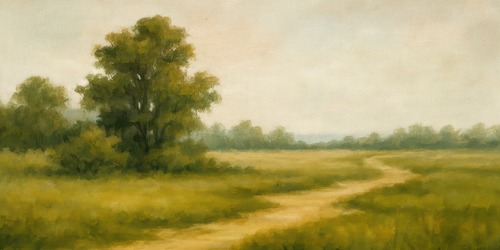 Serene Green Valley Peaceful Countryside Landscape Under Cloudy Sky Illustrations Fine Traditional Colorful Dark Living Room Bedroom Office