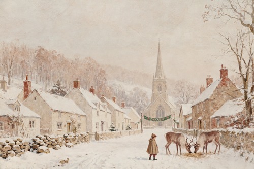 Framed Rustic Christmas Village Peaceful Snowy Street Illustration Living Room Bedroom Office NATURAL
